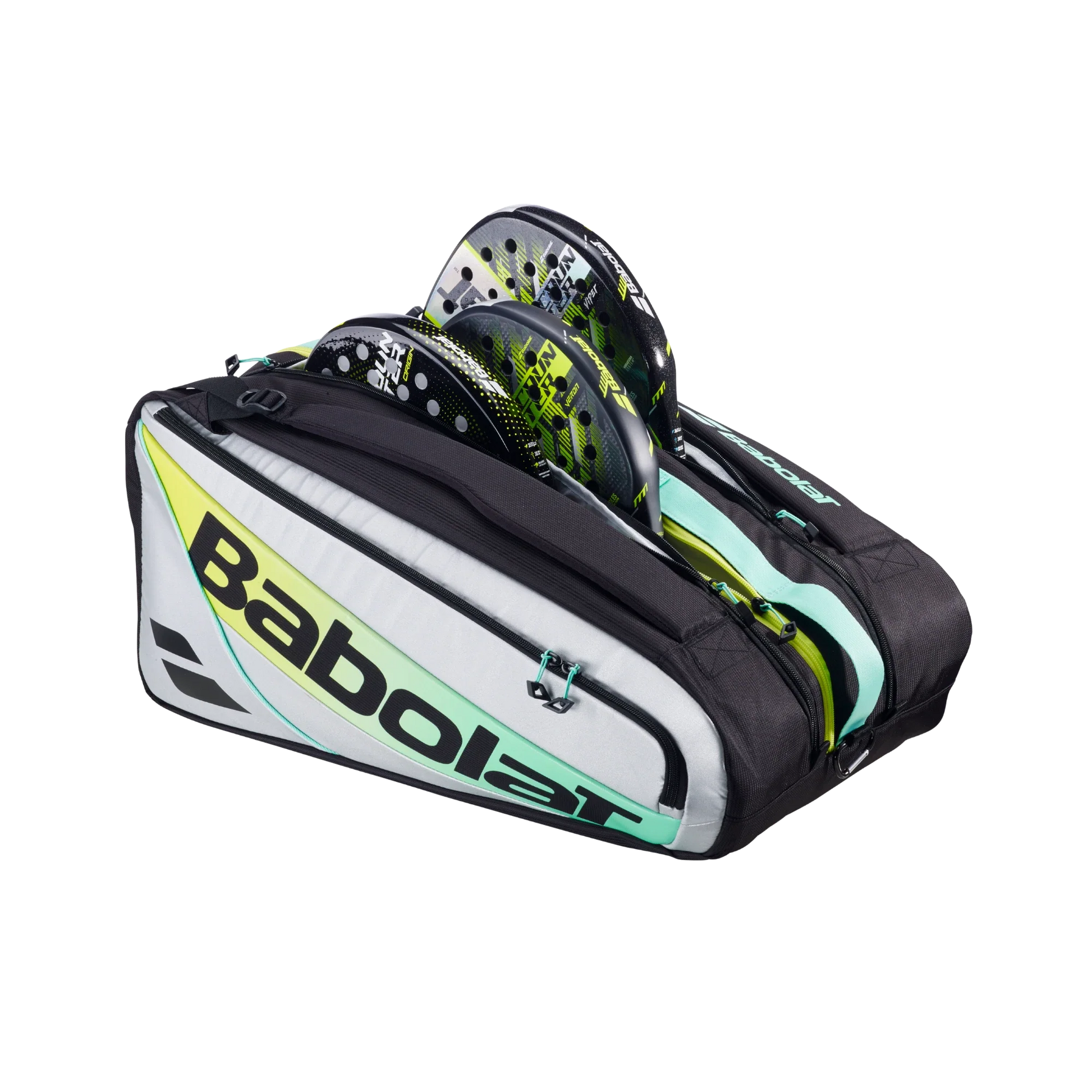 The Babolat RH Pro Padel bag is much more than just an accessory. It is a symbol of performance, a combination of style and expertise for expert players who aim for excellence on the court. Specifically designed to meet the needs of expert players, this padel bag is made unique by its large capacity, advanced organization capabilities, and outstanding usability. Its exterior material and lining are made entirely from recycled materials, offering the durability that is demanded of Babolat bags.